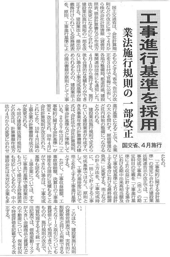 2010/02/04 工事進行基準を採用/業法施行規則の一部改正/国交省、4月施行