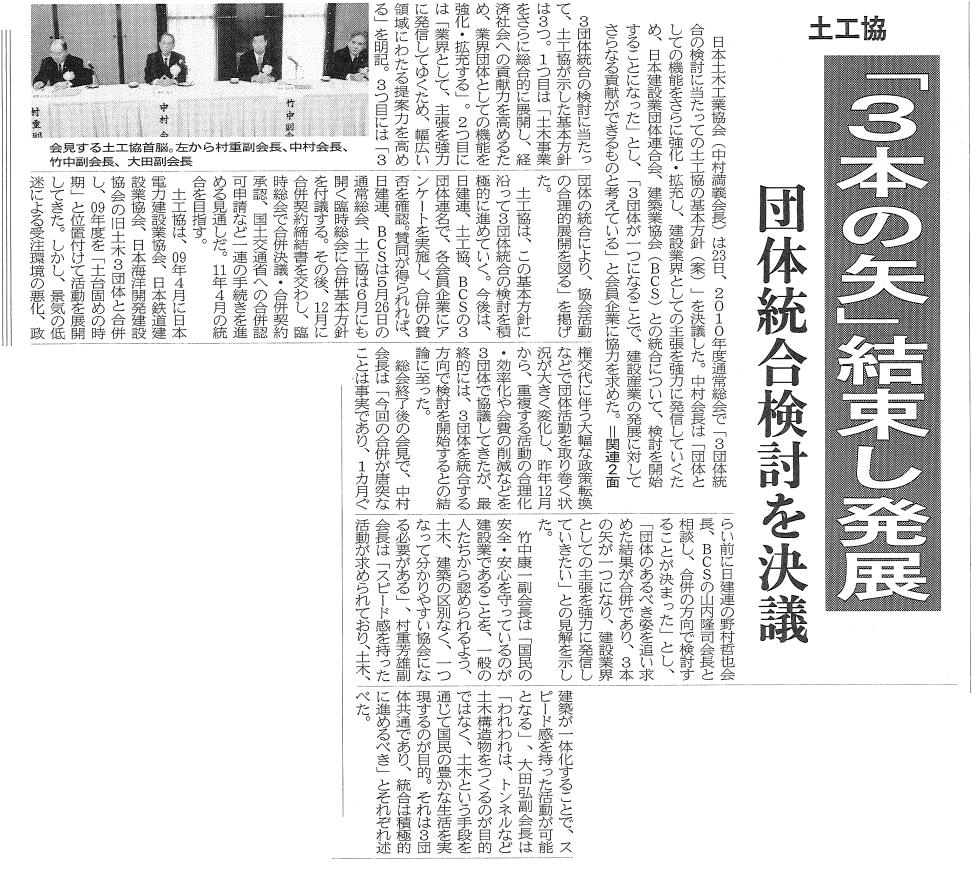 2010/4/26 土工協「3本の矢」結束し発展/団体統合検討を決議