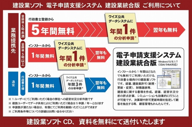 インストール後、1年間は完全無料≪提携先行政書士会会員様は加えて入会後5年間無料≫、翌年以降もワイズ公共データシステムへ年間3件以上≪提携先行政書士会会員様は年間1件≫の経営状況分析申請をいただくことで引き続き無料にてご利用いただくことができます。