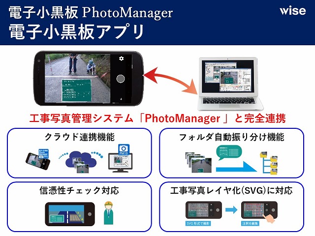 「電子小黒板PhotoManager」は、スマホやタブレットで撮影した写真に黒板を埋め込み・黒板編集をすることができ、国交省大臣官房技術調査課より発出された「デジタル工事写真の小黒板情報電子化について」に準拠し、写真の改ざん検知にも対応したアプリです。