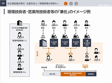 今回の研修会では、「建設業法改正/配置技術者兼任・資本性借入金の取り扱い」と題しまして、令和6年度の建設業法改正で施行された配置技術者配置の合理化について、複数現場や営業所技術者を兼務できる条件について説明させていただきました。