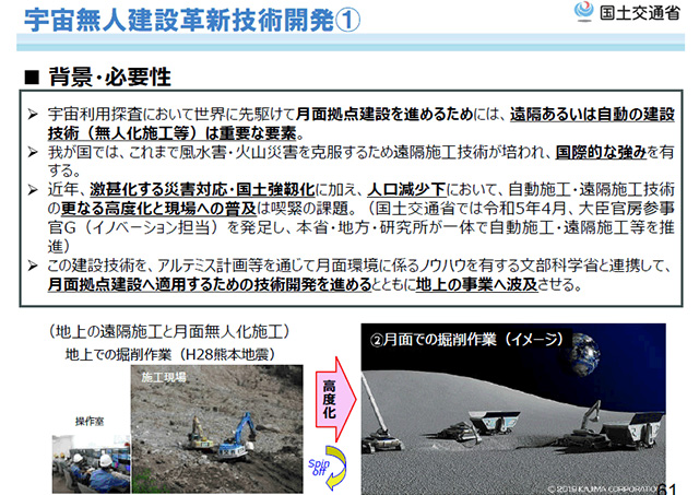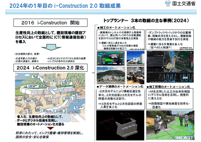 講演では、生産性向上に向けた自動施工の推進として、i-Construction2.0の成果やICT施工StageⅡの取組事例、建設機械遠隔施工の実例、施工管理の省力化、宇宙無人建設確信技術開発等への取組についてお話しいただきました。