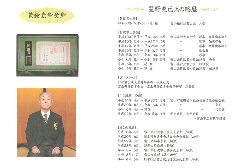 2025/10/27 星野克己氏(富山県行政書士会)の「黄綬褒章受章祝賀会」が開催されました