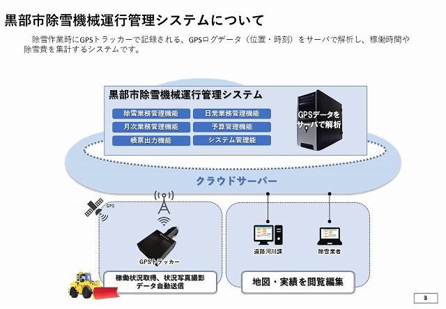 「黒部市除雪機械運行管理システム」は、除雪業務時にGPSトラッカーで稼働時間や除雪・散布した路線を記録し、
