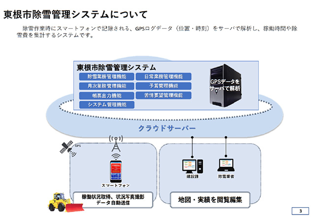 「東根市除雪管理システム」は、除雪や凍結防止剤散布業務の管理システムです。
