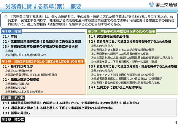 中建審のワーキンググループでの11回の議論によって作成された「労務費に関する基準(案)」について、審議・承認された。